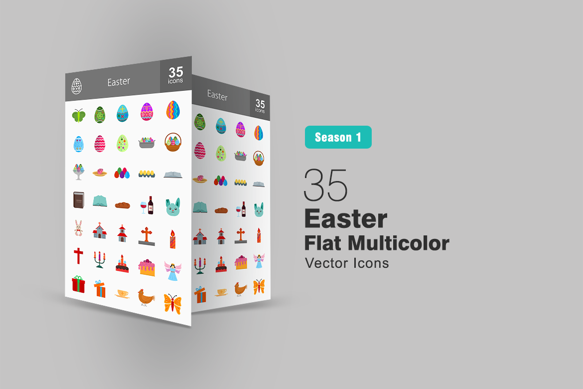 Download Набор иконок "35 Easter Flat Multicolor Icon Set" / 35 Easter Flat Multicolor Icon Set - Набор иконок на тему графика book icon bunny easter butterfly egg candle rabbit decoration celebration chicken church christian angel drinks present eggs basket iconbunny flat