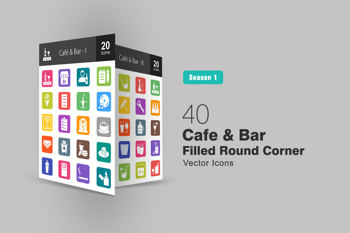 Download Набор иконок "40 Cafe & Bar Filled Round Corner Icon Set" / 40 Cafe & Bar Filled Round Corner Icon Set - Набор иконок на тему графика cafe,icon,bar,drinks,barkeeper,menu,music,wifi,orders,coffee,sandwich,fries,lunch,cake,milkshake,cigarettes,lighter,cigar,smoking,pipe