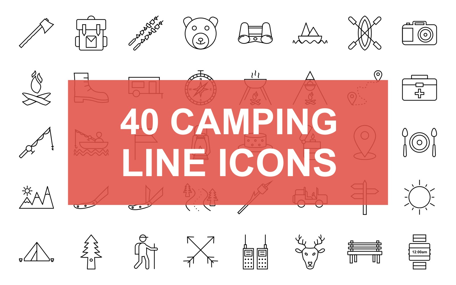 Download Набор иконок "40 Camping Line Black Icon Set" / 40 Camping Line Black Icon Set - Набор иконок на тему графика camping,axe,bag,pack,barbeque,bear,binoculars,boat,camera,camp,fire,boot,trailer,compass,cooking,food,distance,first,aid,fishing