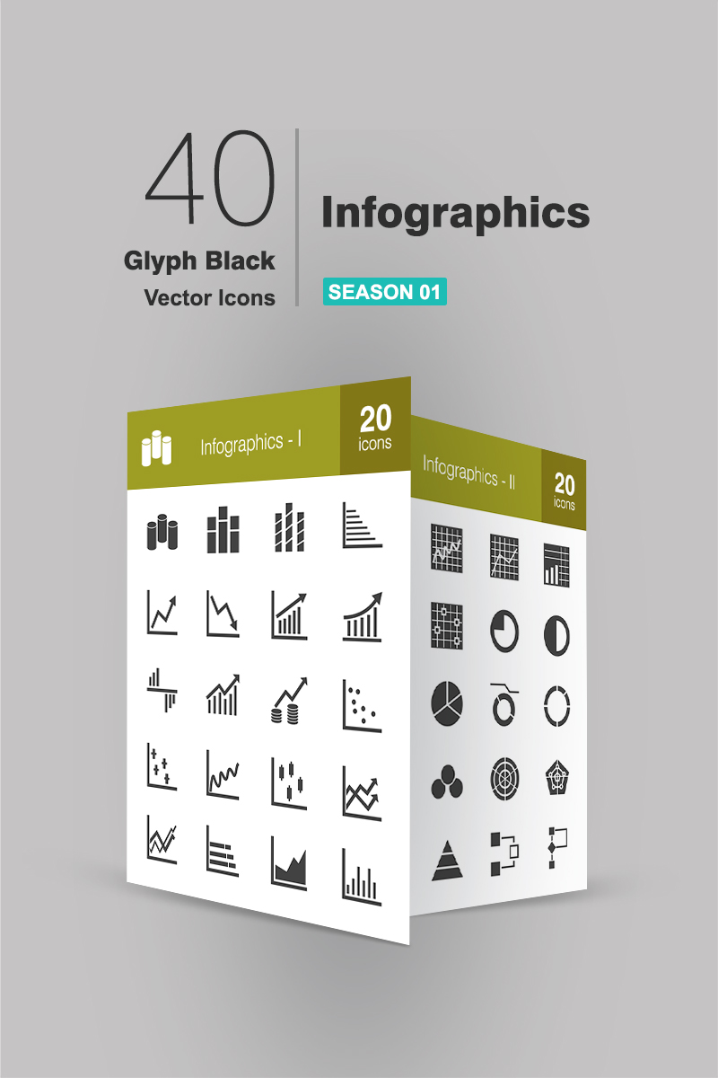 Download Набор иконок "40 Infographics Glyph Icon Set" / 40 Infographics Glyph Icon Set - Набор иконок на тему графика infographics icon graphs charts statistics bars cylindrical vertical horizontal bar chart rising line declining inflation graphical representation flowchart donut scatter