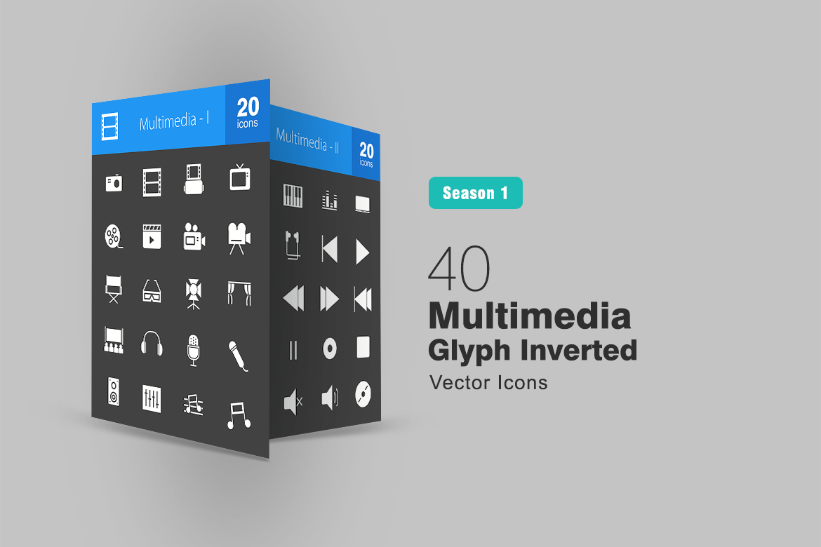 Download Набор иконок "40 Multimedia Glyph Inverted Icon Set" / 40 Multimedia Glyph Inverted Icon Set - Набор иконок на тему графика camera icon roll television play media multimedia music video speaker volume stage microphone piano film controls earphones iconbunny flat icons