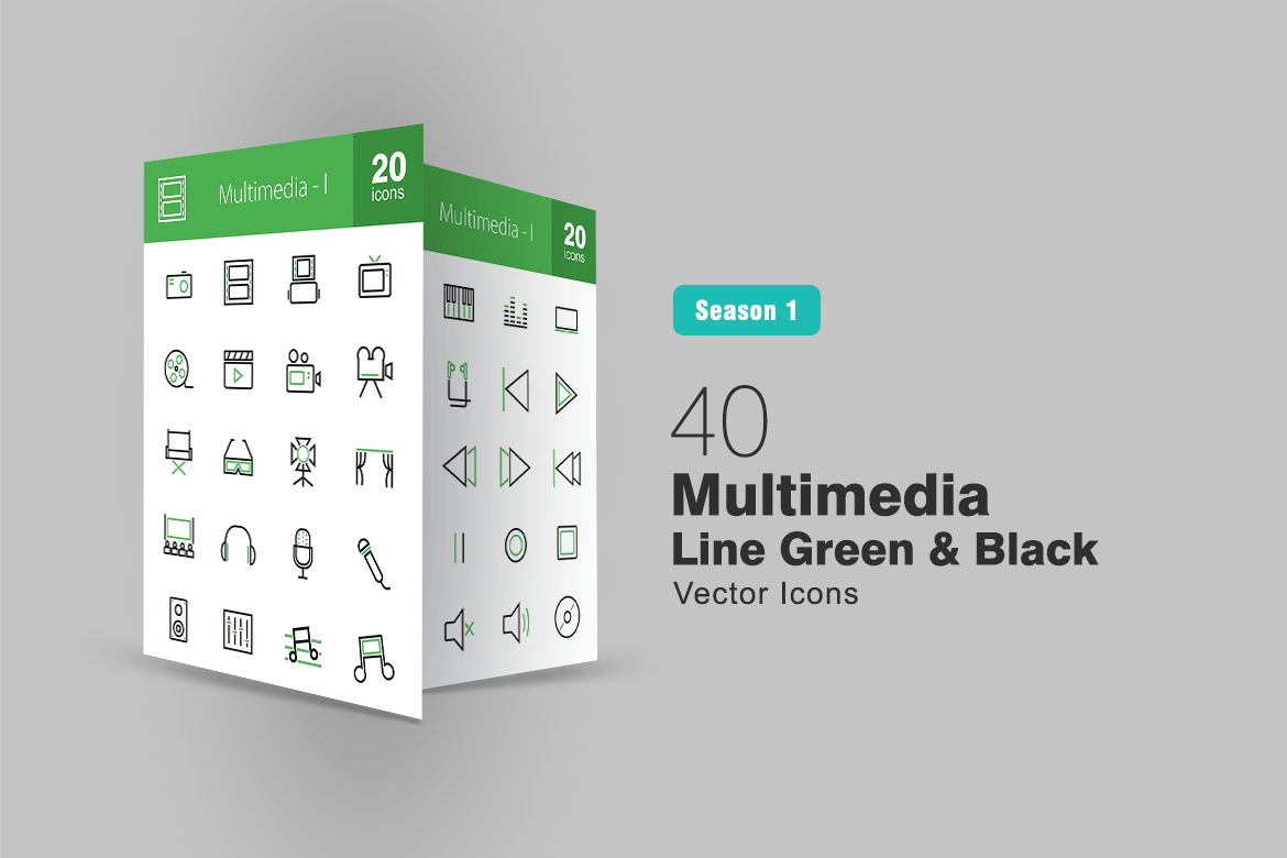 Download Набор иконок "40 Multimedia Line Green & Black Icon Set" / 40 Multimedia Line Green & Black Icon Set - Набор иконок на тему графика camera icon roll television play media multimedia music video speaker volume stage microphone piano film controls earphones iconbunny flat icons