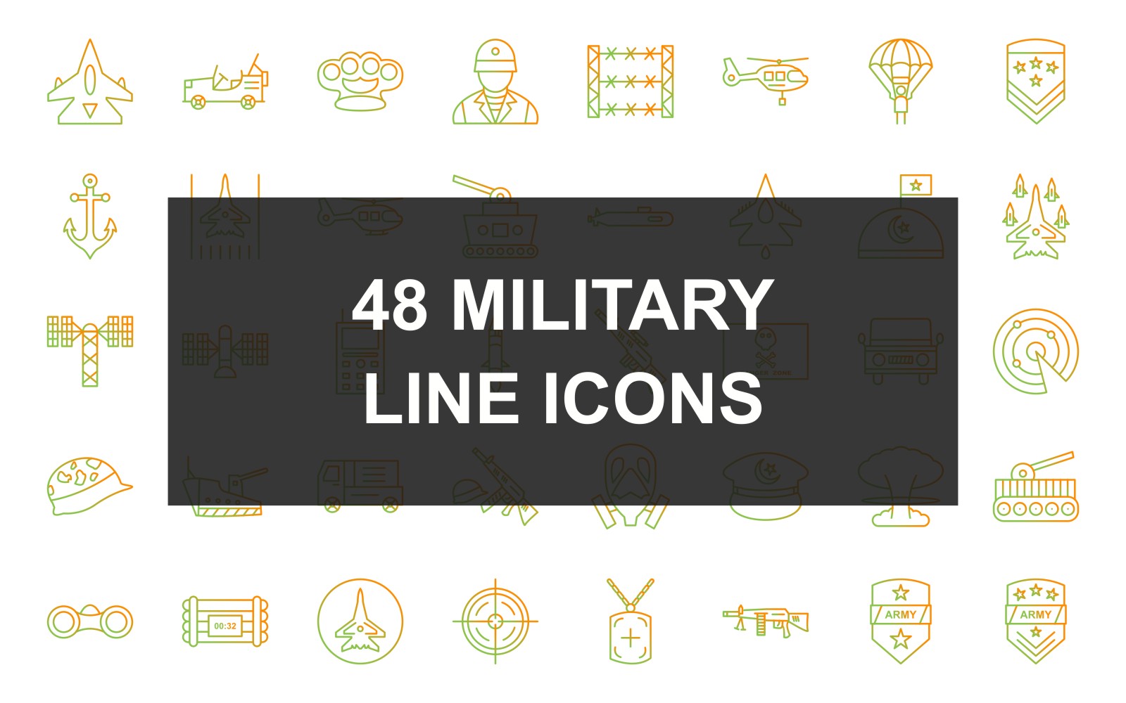 Download Набор иконок "48 Military Line Gradient Icon Set" / 48 Military Line Gradient Icon Set - Набор иконок на тему military fighter jet,tank,jeep,time bomb,revolver,life jacket,bomb,knuckle,soldier,wire,helicopter,parachute,military badge,anchor,airbase,submarine,military base,plane dropping missile,satellite towe