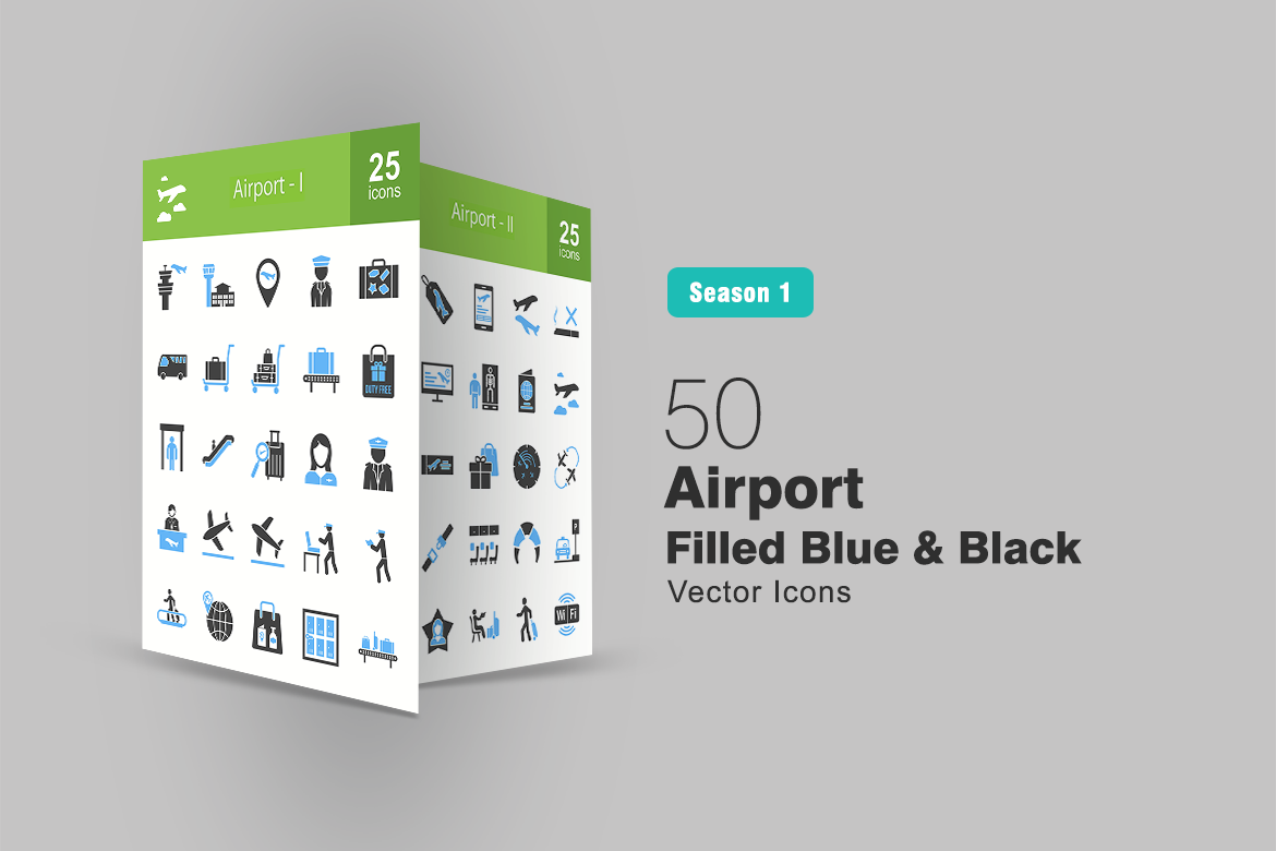 Download Набор иконок "50 Airport Filled Blue & Black Icon Set" / 50 Airport Filled Blue & Black Icon Set - Набор иконок на тему графика airport,icon,building,security,bus,luggage,passanger,crew,flight,plane,aeroplane,bag,fly,pilot,hostess,information,ticket,runway,seats,passport