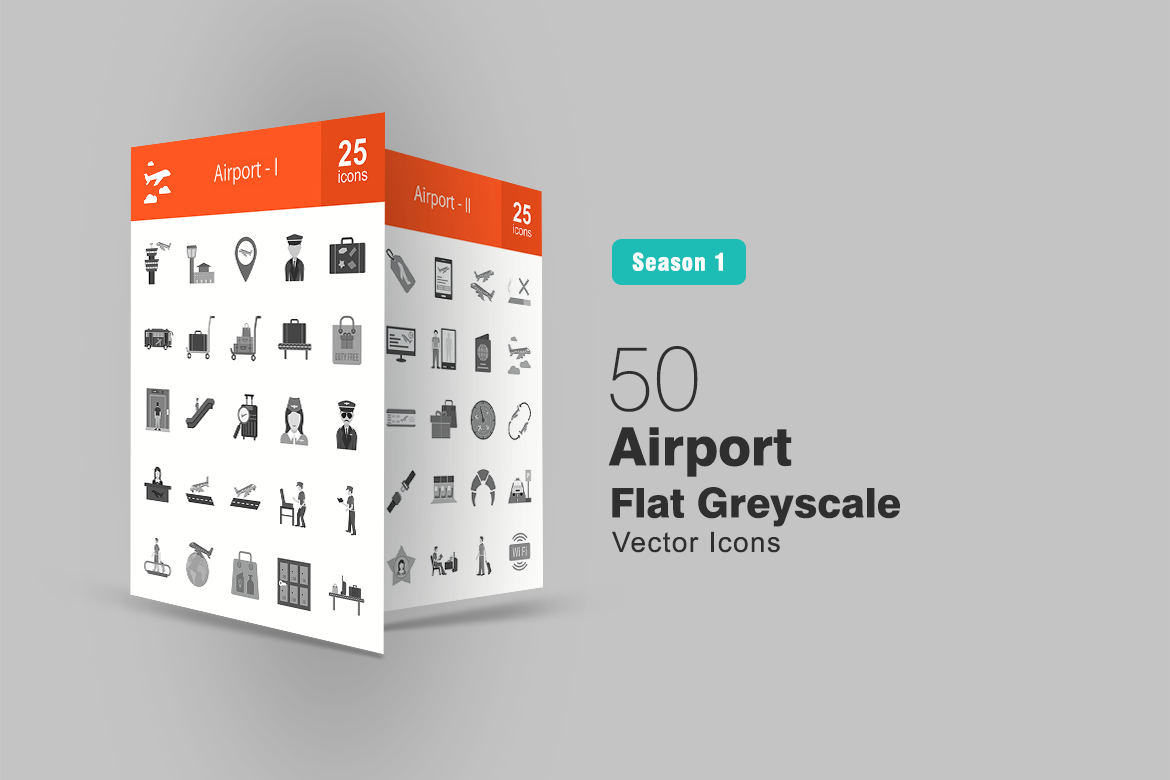 Download Набор иконок "50 Airport Flat Greyscale Icon Set" / 50 Airport Flat Greyscale Icon Set - Набор иконок на тему графика airport,icon,building,security,bus,luggage,passanger,crew,flight,plane,aeroplane,bag,fly,pilot,hostess,information,ticket,runway,seats,passport