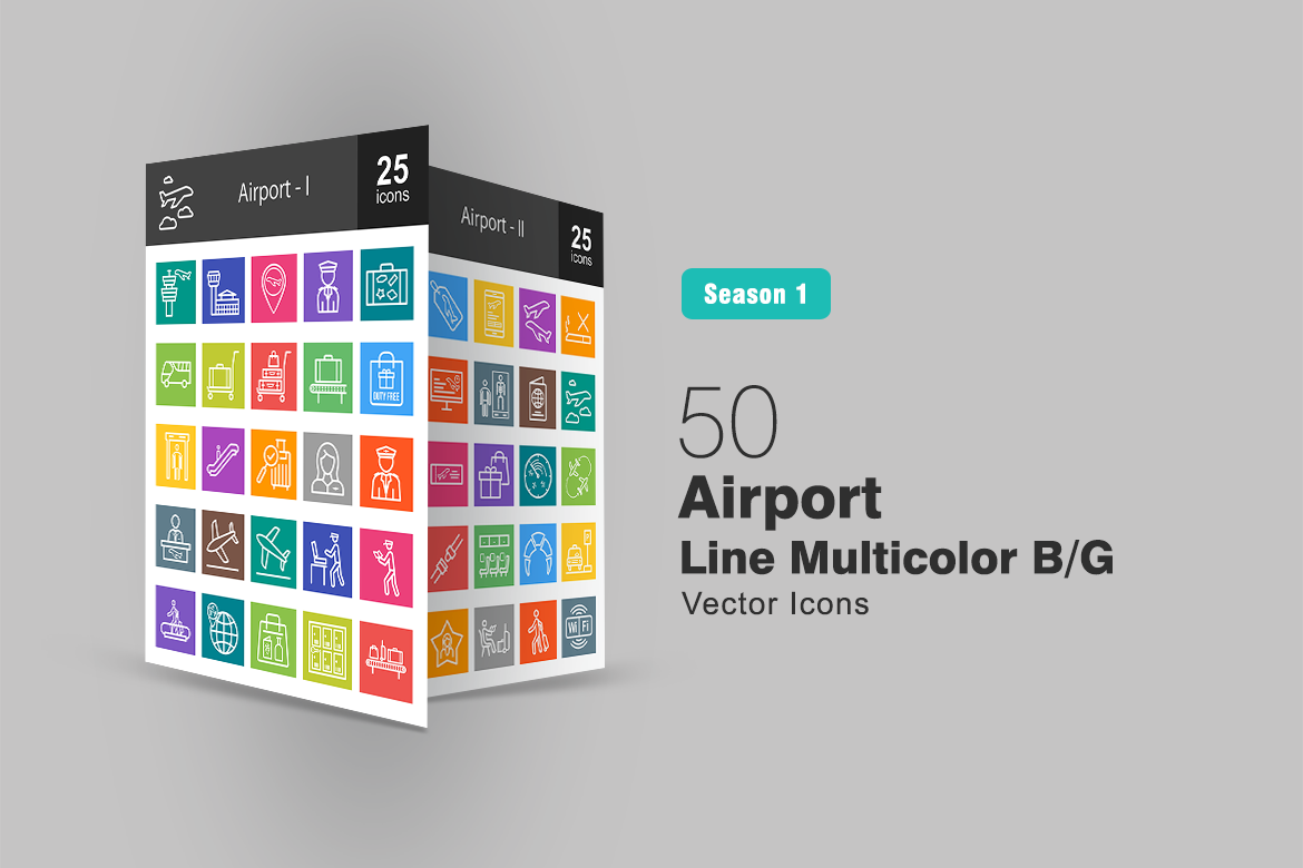 Download Набор иконок "50 Airport Line Multicolor B/G Icon Set" / 50 Airport Line Multicolor B/G Icon Set - Набор иконок на тему графика airport,icon,building,security,bus,luggage,passanger,crew,flight,plane,aeroplane,bag,fly,pilot,hostess,information,ticket,runway,seats,passport