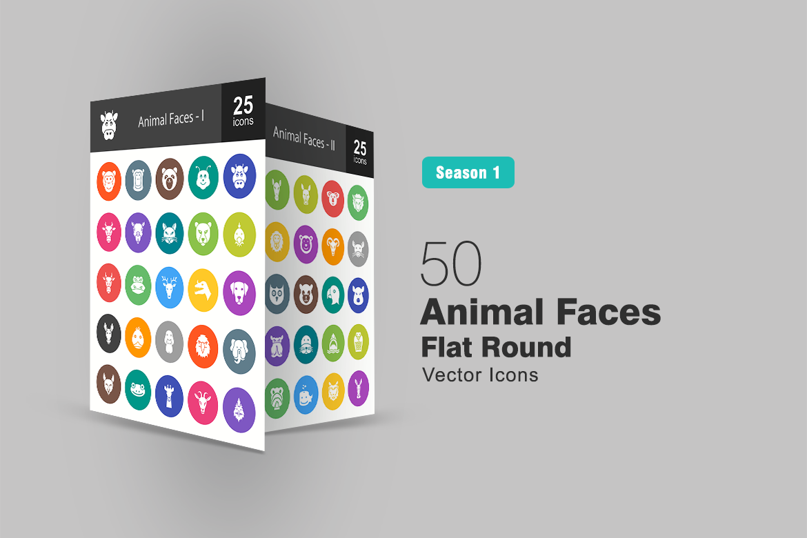 Download Набор иконок "50 Animal Faces Flat Round Icon Set" / 50 Animal Faces Flat Round Icon Set - Набор иконок на тему графика animals,icon,ape,bear,bee,buffalo,camel,cat,chicken,cow,deer,dog,donkey,duck,elephant,frog,gpat,horse,kangaroo,lion