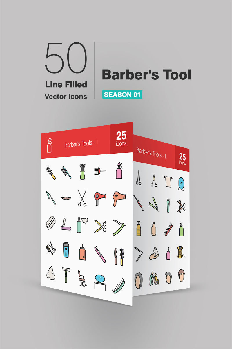 Download Набор иконок "50 Barber’s Tools Filled Line Icon Set" / 50 Barber’s Tools Filled Line Icon Set - Набор иконок на тему графика barber icon hair cut style comb brush moustache dryer razor scissors trimmer cream safety towel straightener thread short long iconbunny