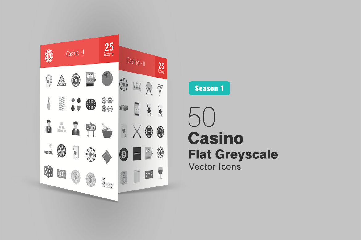 Download Набор иконок "50 Casino Flat Greyscale Icon Set" / 50 Casino Flat Greyscale Icon Set - Набор иконок на тему графика casino,icon,cards,bet,play,slot,machine,pool,ball,bowling,chips,dealer,gold,manager,sign,champagne,bottle,cigar,darts,deck