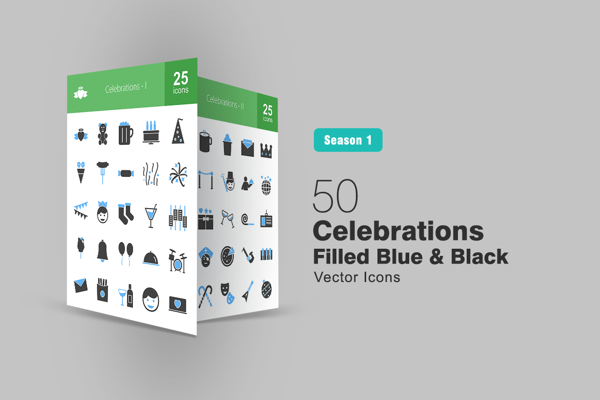 Download Набор иконок "50 Celebrations Filled Blue & Black Icon Set" / 50 Celebrations Filled Blue & Black Icon Set - Набор иконок на тему графика celebrations icon beer cake hat flowers sausage candy fireworks cocktail roses balloons bells food drums fries wine coffee invitation mafician