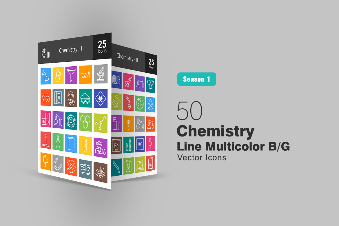 Download Набор иконок "50 Chemistry Line Multicolor B/G Icon Set" / 50 Chemistry Line Multicolor B/G Icon Set - Набор иконок на тему графика chemistry,icon,science,chemical,flask,funnel,microscope,poisonous,oxygen,mask,goggles,hazard,experiment,atom,structure,molecule,burner,tongs,beaker,scientist
