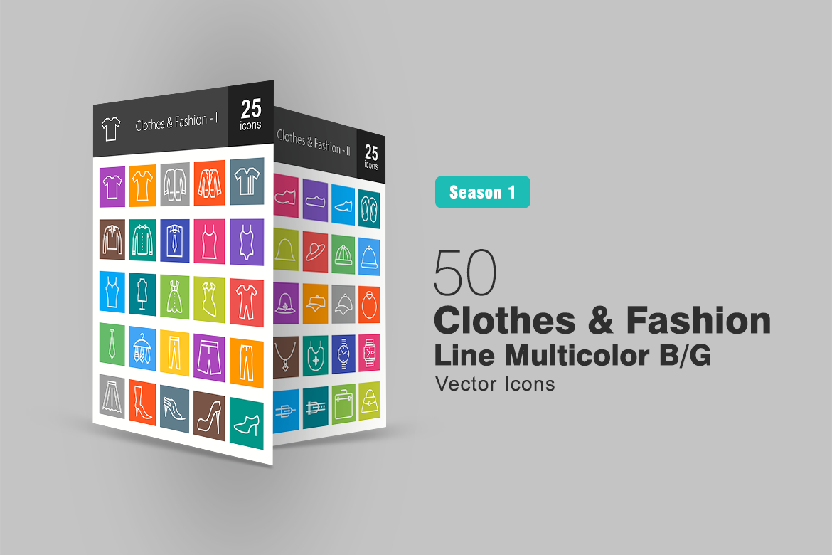 Download Набор иконок "50 Clothes & Fashion Line Multicolor B/G Icon Set" / 50 Clothes & Fashion Line Multicolor B/G Icon Set - Набор иконок на тему графика clothes icon fashion apparel pants shirt tie shoes bag belt watch shorts trousers boots hat cap dress glasses iconbunny flat