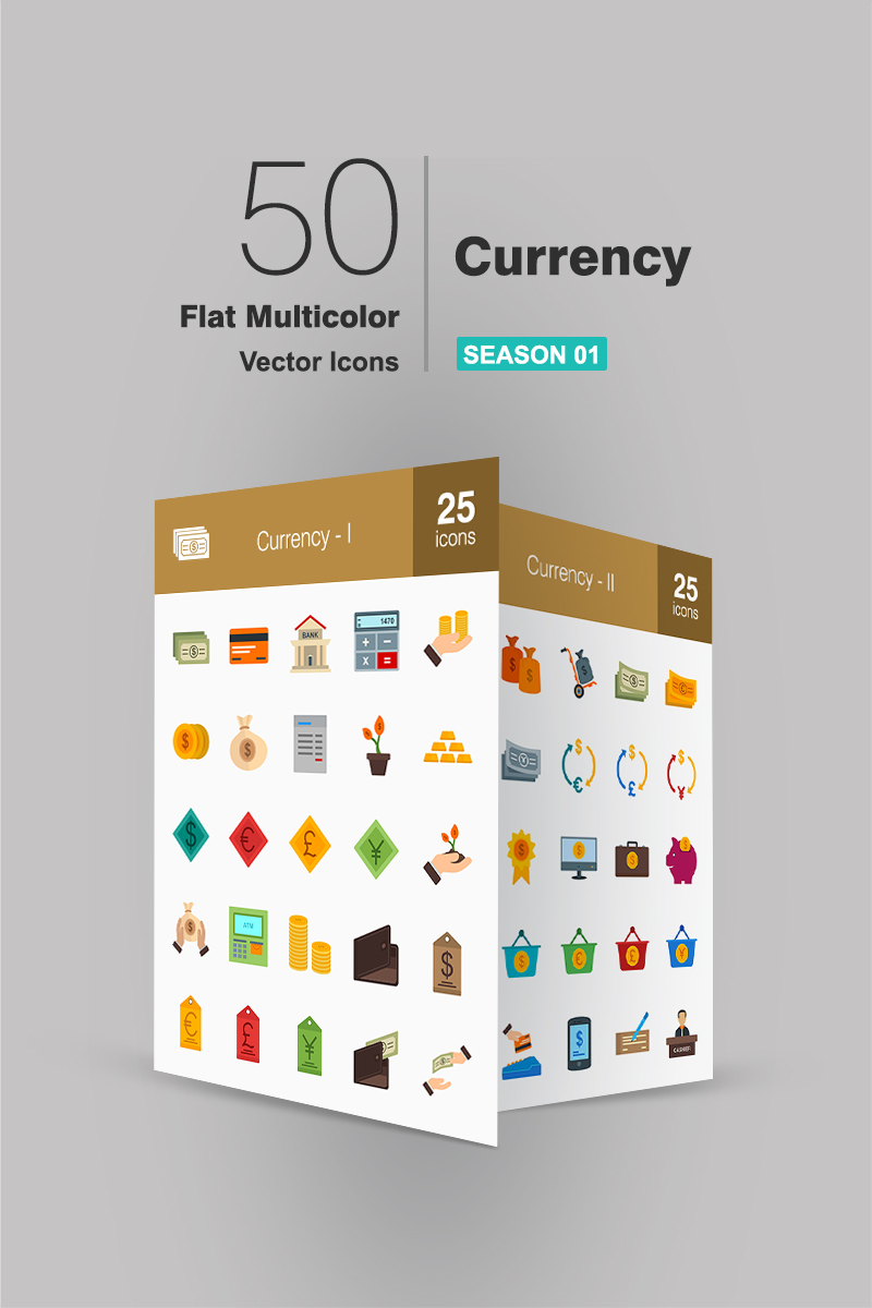 Download Набор иконок "50 Currency Flat Multicolor Icon Set" / 50 Currency Flat Multicolor Icon Set - Набор иконок на тему графика currency icon money credit card bank inflation dollar coin bill gold euro pound yen investment cash wallet donation cart online
