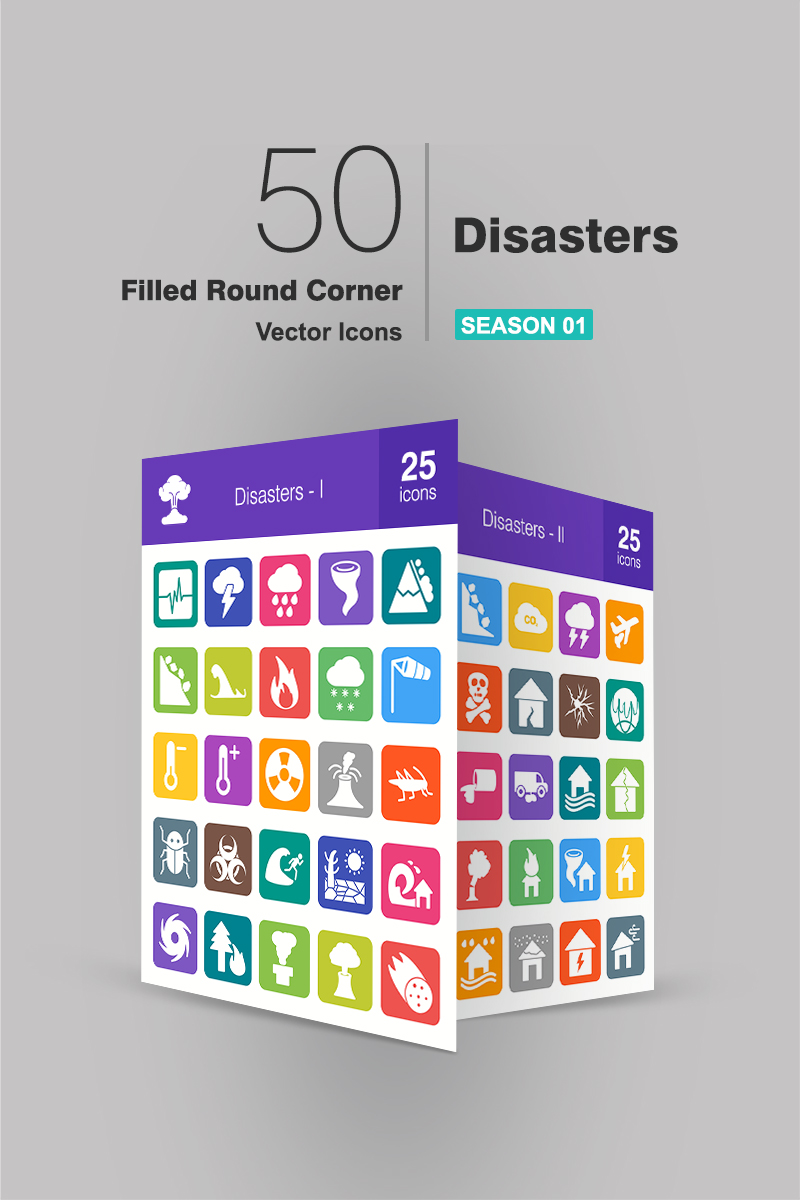 Download Набор иконок "50 Disasters Filled Round Corner Icon Set" / 50 Disasters Filled Round Corner Icon Set - Набор иконок на тему графика blast icon bunny chemical leak cyclone danger disaster drought earthquake electricity epidemic fire icon flat floods fuel leakage hailstorm hurricane