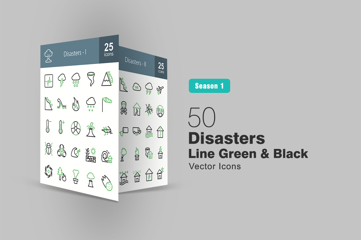 Download Набор иконок "50 Disasters Line Green & Black Icon Set" / 50 Disasters Line Green & Black Icon Set - Набор иконок на тему графика disaster,icon,earthquake,lightning,rain,hurricane,landslide,storm,fire,snow,volcano,epidemic,floods,drought,tsunami,cyclone,toxicity,thunderstorm,fuel,leakage
