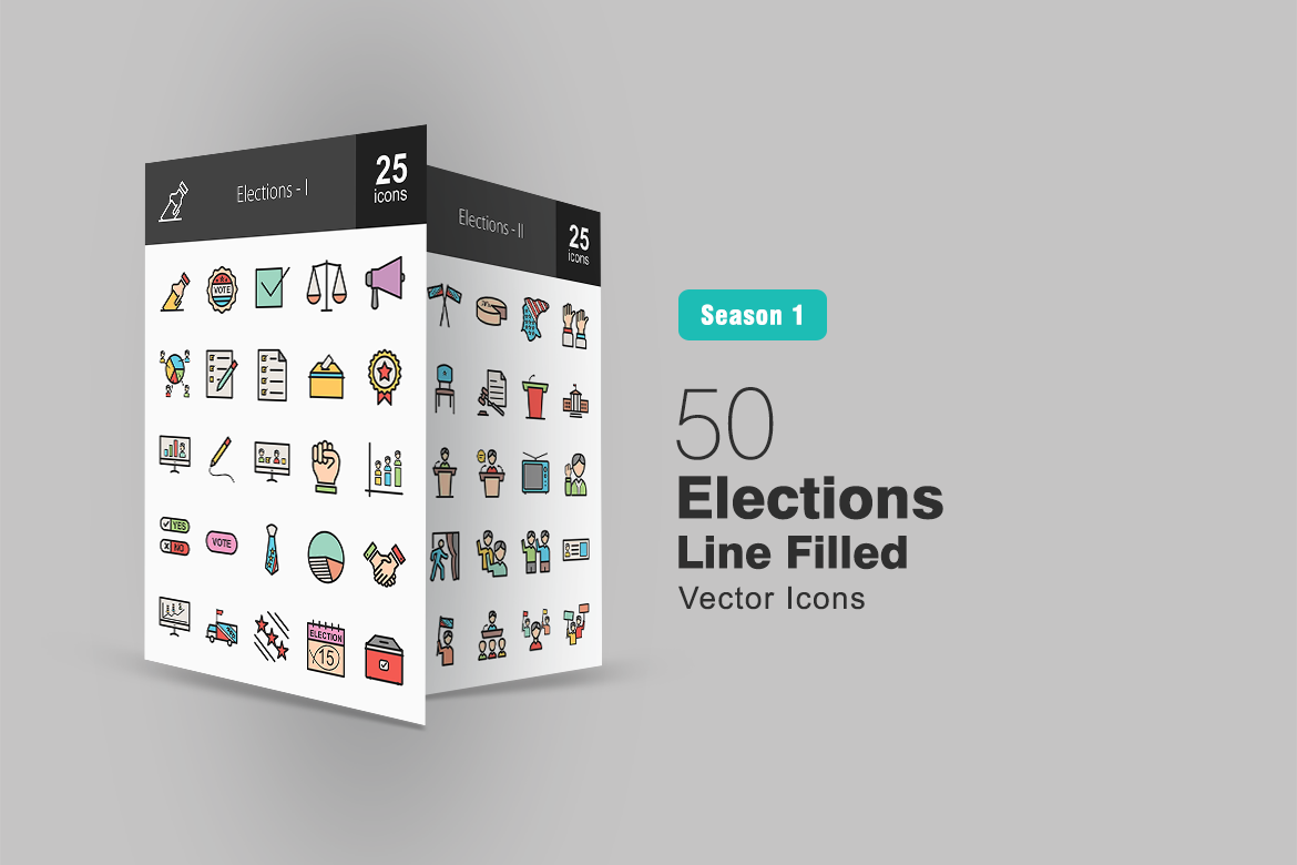Download Набор иконок "50 Elections Filled Line Icon Set" / 50 Elections Filled Line Icon Set - Набор иконок на тему графика elections icon vote sticker announcement candidate statistics ballot paper casting power option handshake graph campaign stars election day box banner