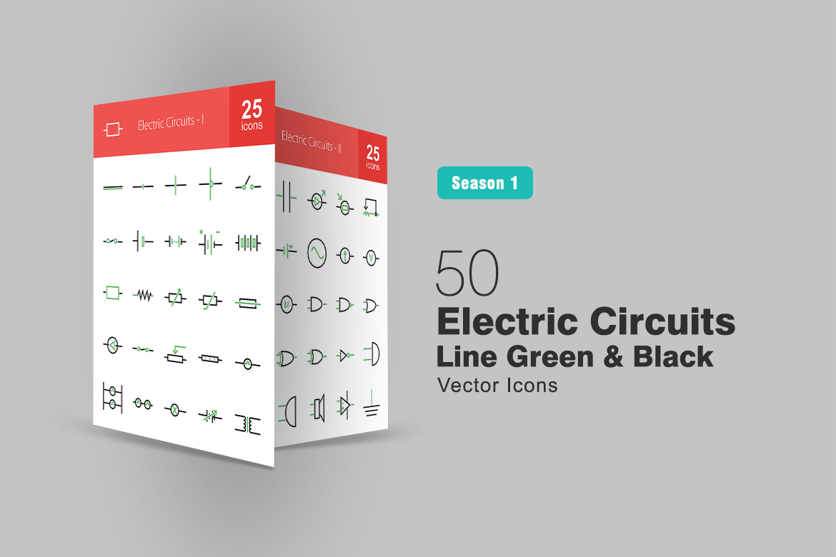 Download Набор иконок "50 Electric Circuits Line Green & Black Icon Set" / 50 Electric Circuits Line Green & Black Icon Set - Набор иконок на тему графика electric icon circuits wire connection switch cell battery resistor fuse lamp heating element transformer inductor capacitor diode motor ammeter iconbunny