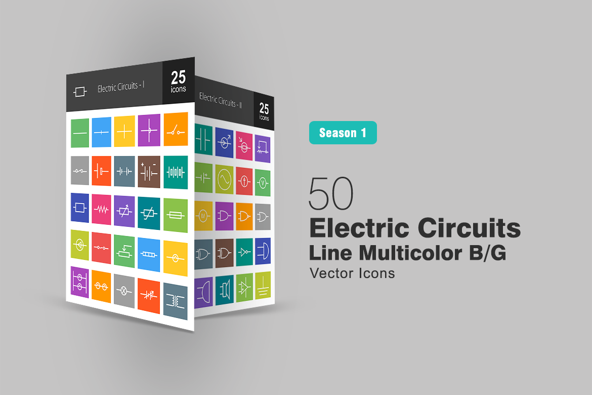 Download Набор иконок "50 Electric Circuits Line Multicolor B/G Icon Set" / 50 Electric Circuits Line Multicolor B/G Icon Set - Набор иконок на тему графика electric icon circuits wire connection switch cell battery resistor fuse lamp heating element transformer inductor capacitor diode motor ammeter iconbunny