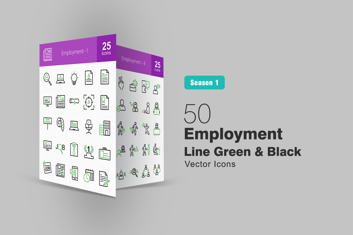 Download Набор иконок "50 Employment Line Green & Black Icon Set" / 50 Employment Line Green & Black Icon Set - Набор иконок на тему графика employment icon job candidate employee wanted user profile resume online advertising diploma target certification hiring post office apply formal position