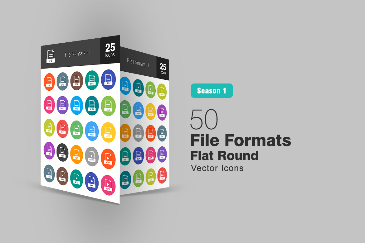 Download Набор иконок "50 File Formats Flat Round Icon Set" / 50 File Formats Flat Round Icon Set - Набор иконок на тему графика files icon ai png jpg mp3 doc txt xls pdf css htm rss js psd xml avi eps iconbunny flat