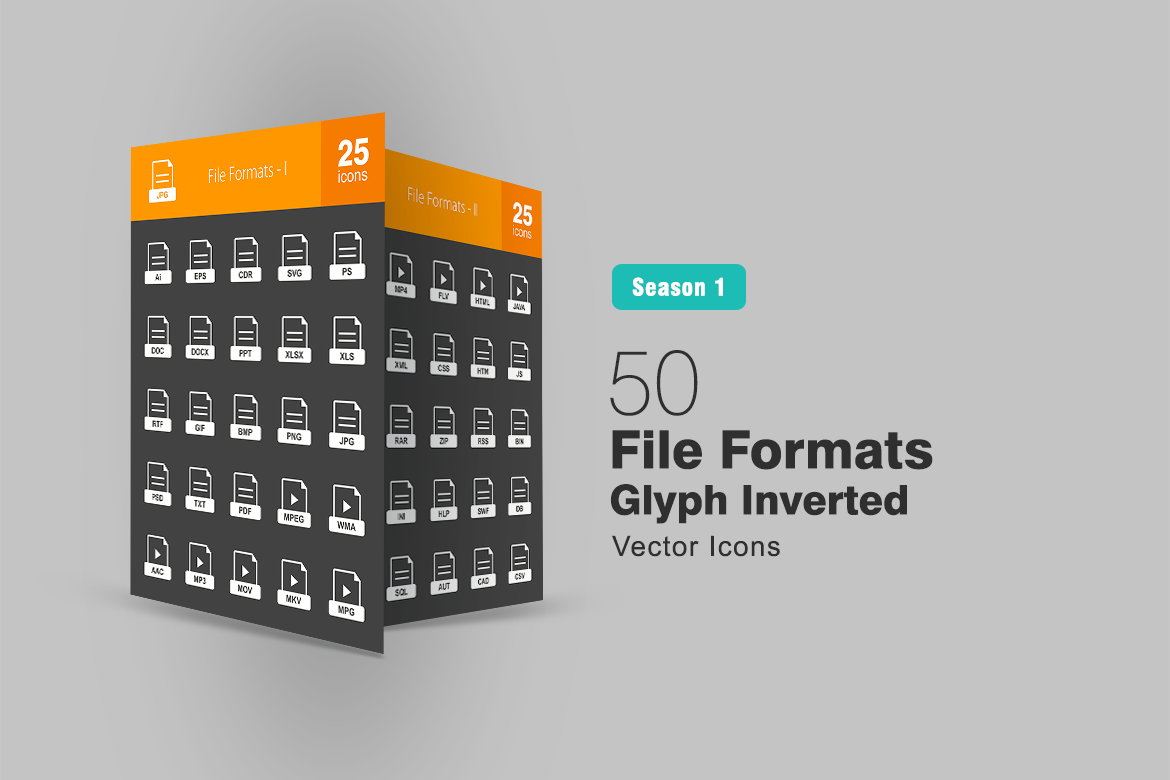 Download Набор иконок "50 File Formats Glyph Inverted Icon Set" / 50 File Formats Glyph Inverted Icon Set - Набор иконок на тему графика files icon ai png jpg mp3 doc txt xls pdf css htm rss js psd xml avi eps iconbunny flat