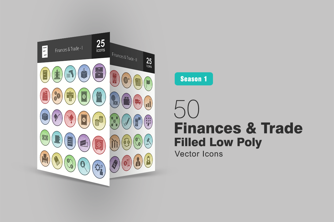 Download Набор иконок "50 Finances & Trade Filled Low Poly Icon Set" / 50 Finances & Trade Filled Low Poly Icon Set - Набор иконок на тему графика finance,icon,trade,business,office,package,files,cashier,cent,documents,dollar,shopping,carrier,euro,stacks,money,notes,shredder,vault,settings