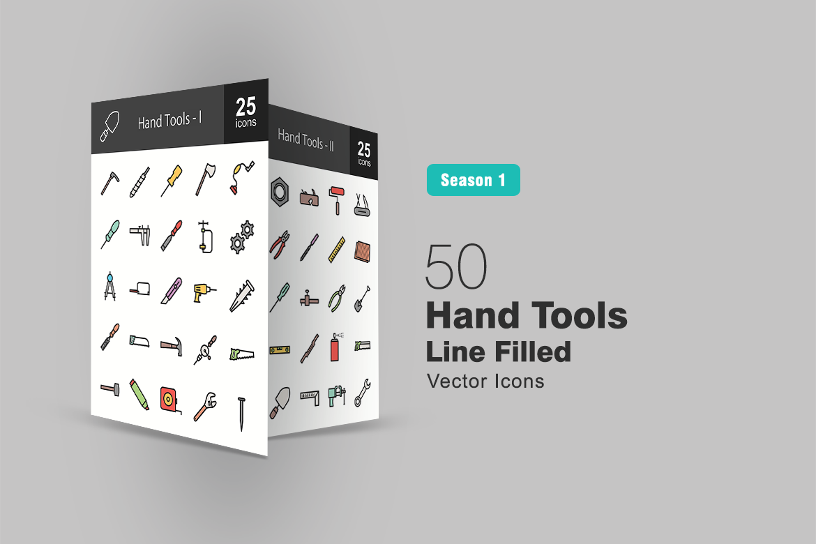 Download Набор иконок "50 Hand Tools Filled Line Icon Set" / 50 Hand Tools Filled Line Icon Set - Набор иконок на тему графика tools,icon,axe,caliper,chisel,cog,wheel,compass,saw,cutter,drill,file,hammer,shovel,marker,measuring,tape,wrench,nail,nut