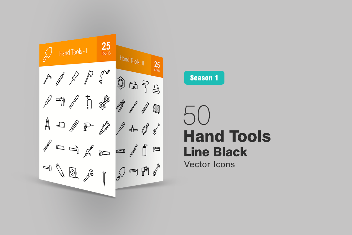 Download Набор иконок "50 Hand Tools Line Icon Set" / 50 Hand Tools Line Icon Set - Набор иконок на тему графика tools,icon,axe,caliper,chisel,cog,wheel,compass,saw,cutter,drill,file,hammer,shovel,marker,measuring,tape,wrench,nail,nut