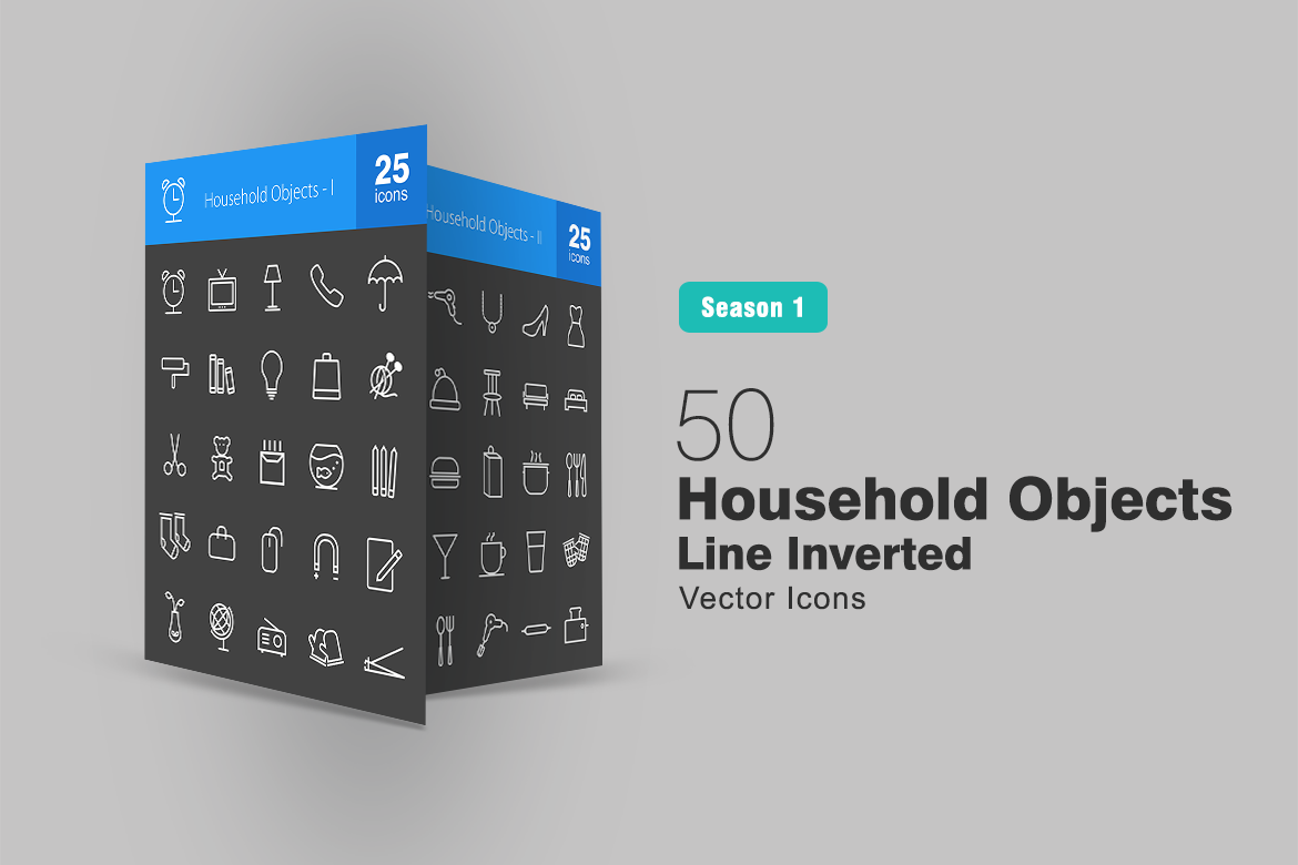 Download Набор иконок "50 Household Objects Line Inverted Icon Set" / 50 Household Objects Line Inverted Icon Set - Набор иконок на тему графика household icon objects items clock phone books bulb shopping bag shoes kitchen accessories mirror crockery milk toaster socks pencils burger