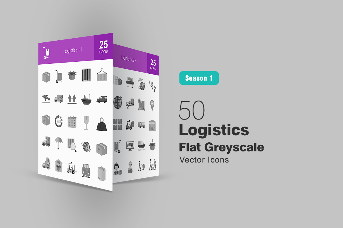 Download Набор иконок "50 Logistics Flat Greyscale Icon Set" / 50 Logistics Flat Greyscale Icon Set - Набор иконок на тему графика package icon logistics transport deliver box parcel flight truck ship car schedule weight broken packed lifter railway assembly line destination