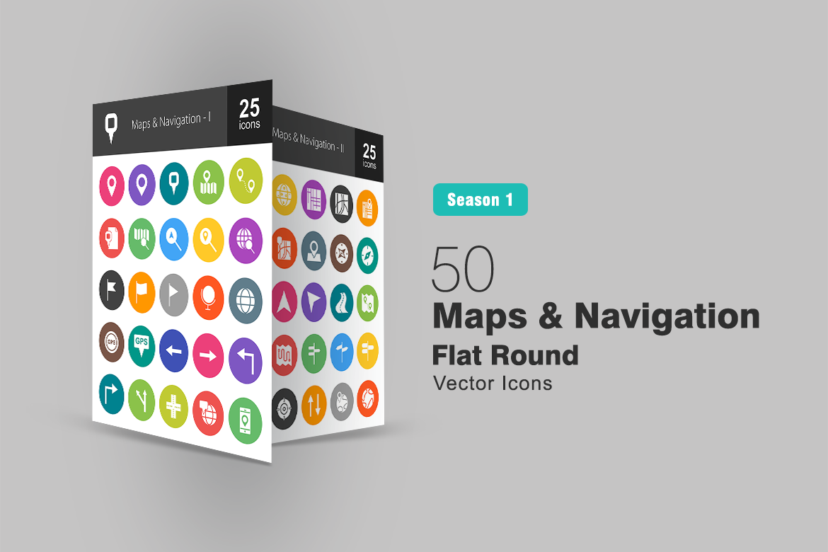 Download Набор иконок "50 Maps & Navigation Flat Round Icon Set" / 50 Maps & Navigation Flat Round Icon Set - Набор иконок на тему графика maps icon navigation marker destination distance location explore direction find flag globe gps road earth marked compass pointer iconbunny