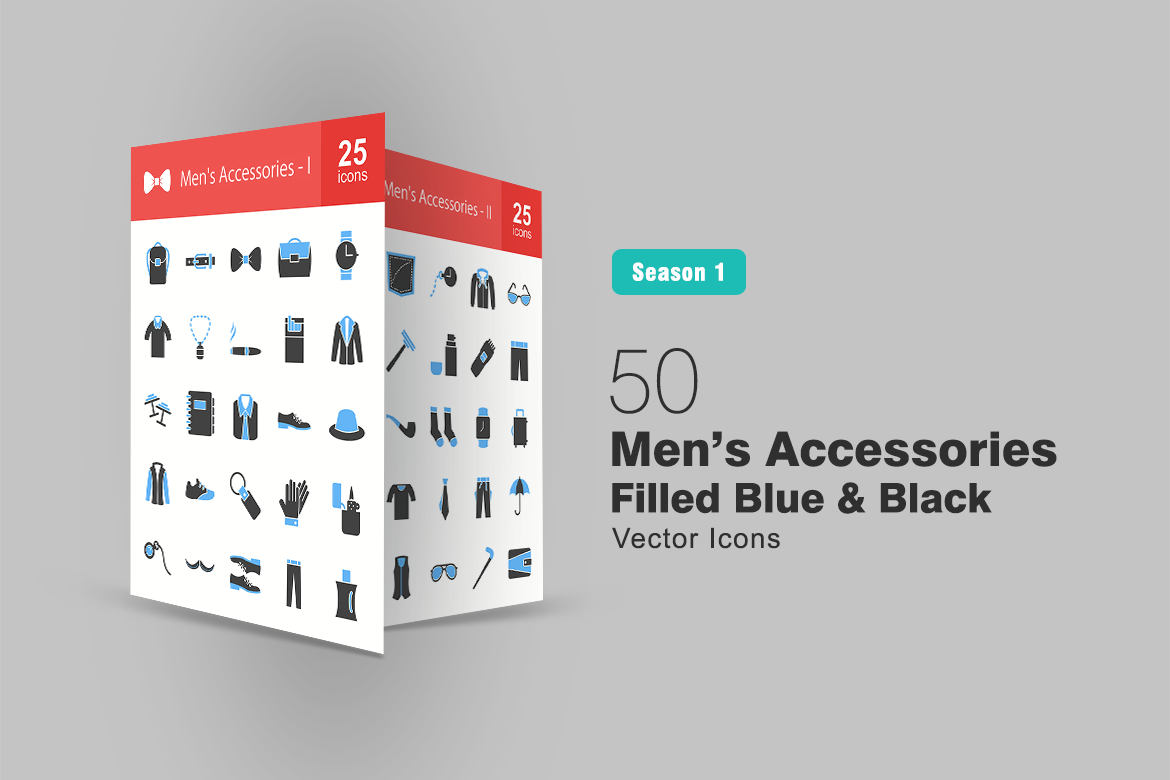 Download Набор иконок "50 Men's Accessories Filled Blue & Black Icon Set" / 50 Men's Accessories Filled Blue & Black Icon Set - Набор иконок на тему графика man,icon,accessories,backpack,belt,tie,briefcase,watch,shirt,chain,cigar,cigarette,coat,cuff,links,diary,shoes,hat,jacket,gloves