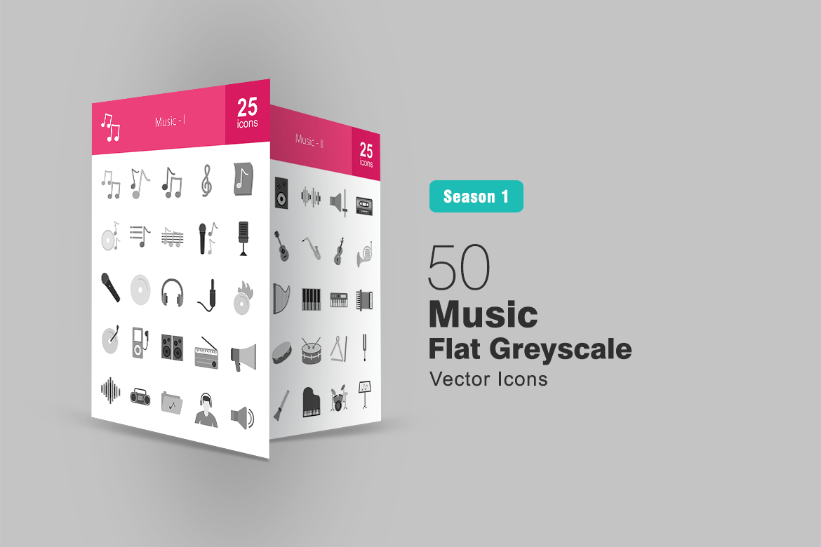 Download Набор иконок "50 Music Flat Greyscale Icon Set" / 50 Music Flat Greyscale Icon Set - Набор иконок на тему графика music icon notes note options staff singing microphone disc playing headphones cd speakers radio cassette player folder volume controller guitar