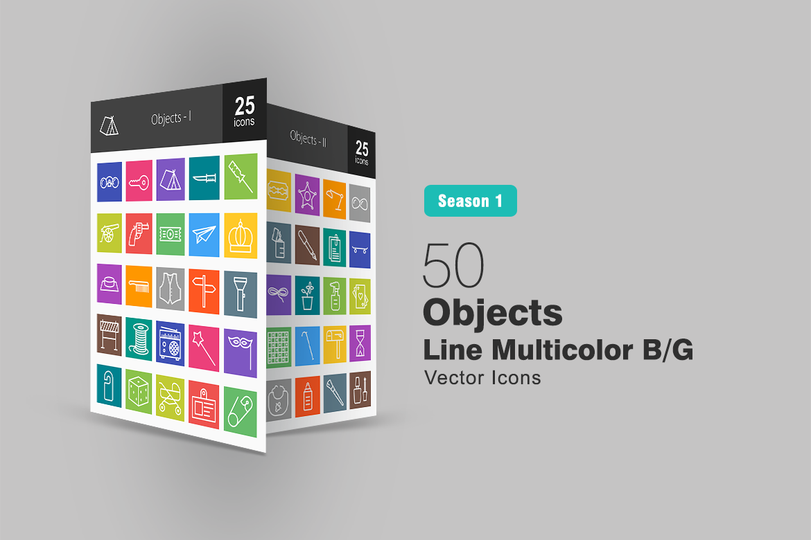 Download Набор иконок "50 Objects Line Multicolor B/G Icon Set" / 50 Objects Line Multicolor B/G Icon Set - Набор иконок на тему графика objects,icon,binoculars,cannon,rope,lamp,safety,pin,mailbox,dice,slippers,goggles,stroller,paper,plane,crown,bottle,skateboard,blade,thread