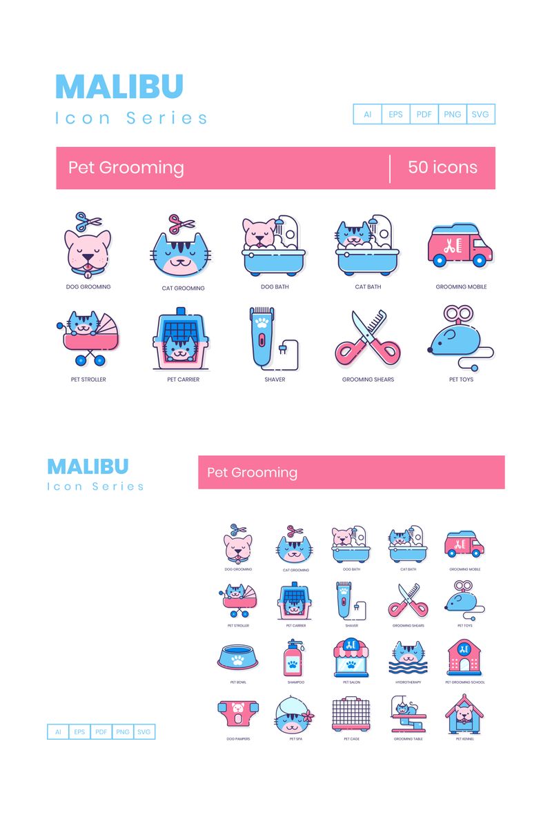 Download Набор иконок "50 Pet Grooming Icons - Malibu Series Set" / 50 Pet Grooming Icons - Malibu Series Set - Набор иконок на тему графика