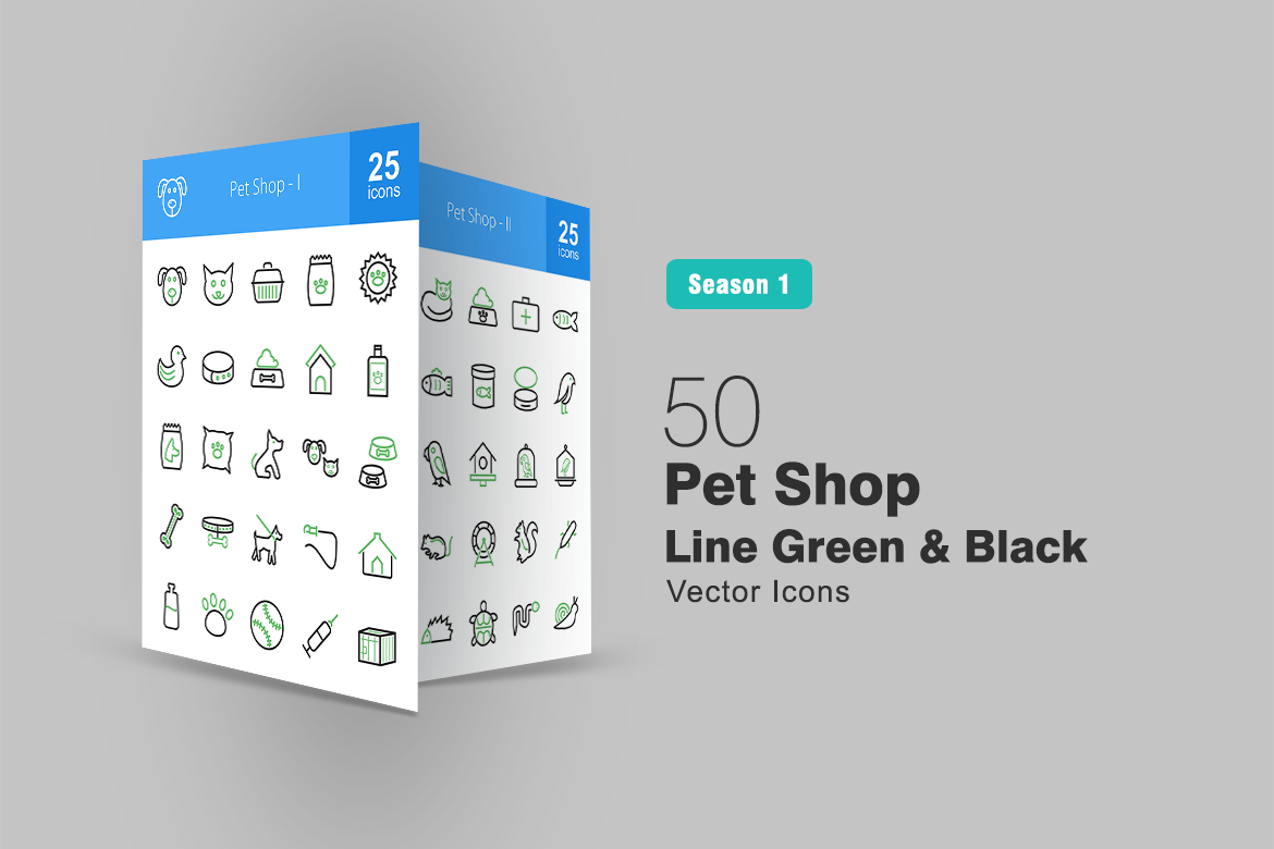 Download Набор иконок "50 Pet Shop Line Green & Black Icon Set" / 50 Pet Shop Line Green & Black Icon Set - Набор иконок на тему графика pet icon shop cage house food tank medicine injection ball milk leash bone cushion veterinary dog cat mouse bird parrot