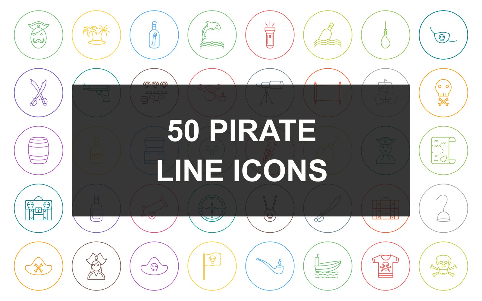Download Набор иконок "50 Pirate Line Round Circle Iconset" / 50 Pirate Line Round Circle Iconset - Набор иконок на тему military pirate in hat,pirate with smoking pipe,male pirate,female pirate,pirate bandana,life saving tube,telescope,cannon balls,castle,island,scroll in bottle,dolphin,torch,bottle in water,noose,eye