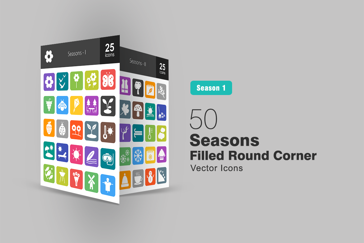 Download Набор иконок "50 Seasons Filled Round Corner Icon Set" / 50 Seasons Filled Round Corner Icon Set - Набор иконок на тему графика seasons icon spring flower birds plan butterfly fruits bee kite park summer beach sunbathe sunny temperature rain snow winters windmill