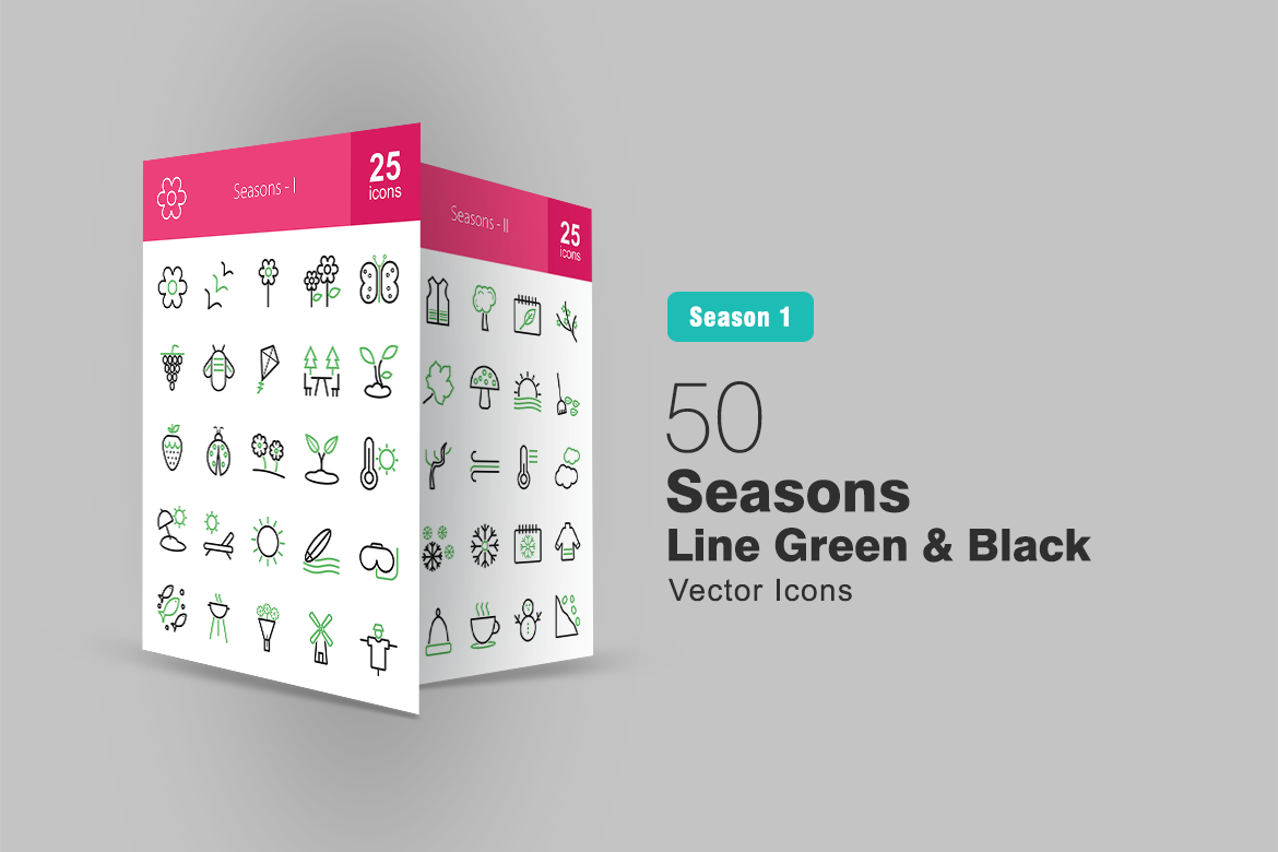Download Набор иконок "50 Seasons Line Green & Black Icon Set" / 50 Seasons Line Green & Black Icon Set - Набор иконок на тему графика seasons icon spring flower birds plan butterfly fruits bee kite park summer beach sunbathe sunny temperature rain snow winters windmill