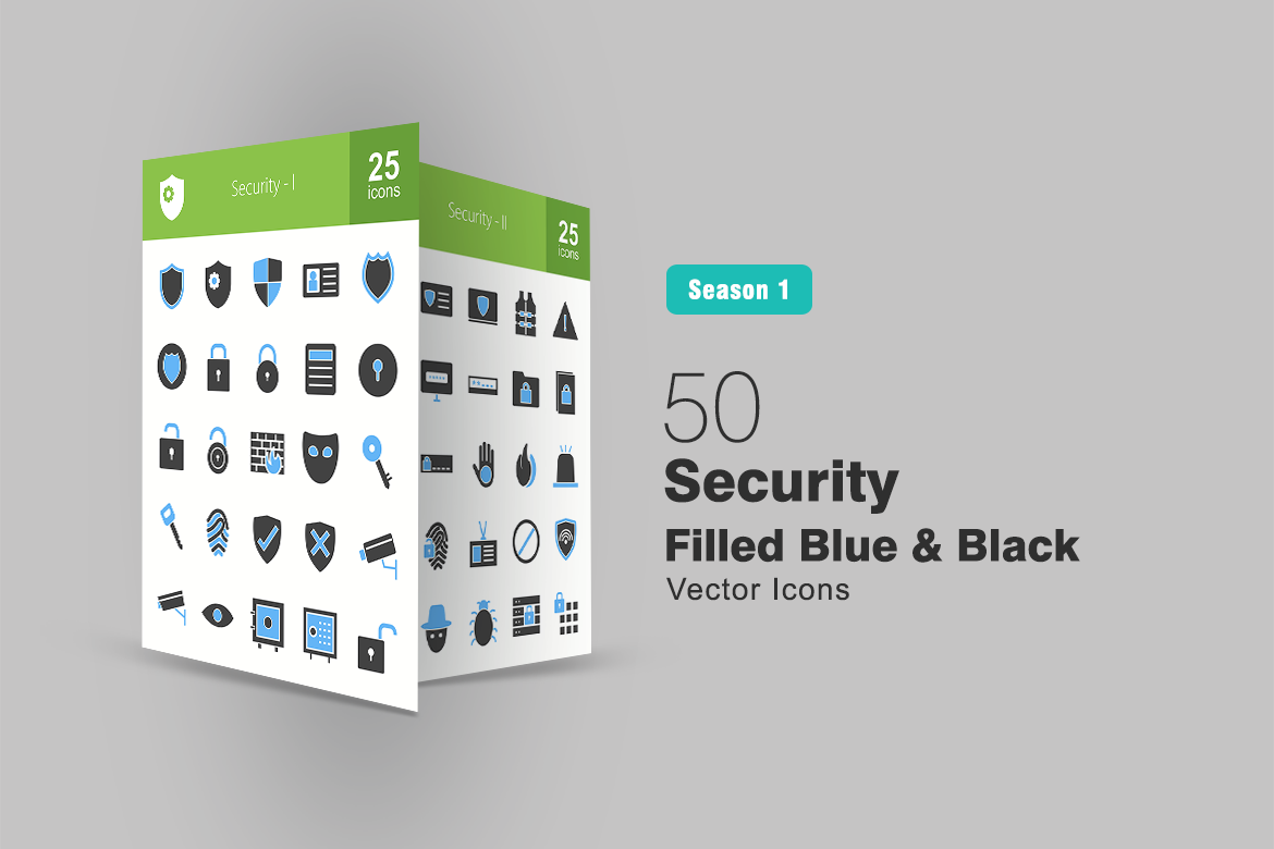 Download Набор иконок "50 Security Filled Blue & Black Icon Set" / 50 Security Filled Blue & Black Icon Set - Набор иконок на тему графика security icon shield identity card police badge lock key firewall mask fingerprint camera eye vault unlock protection system vest warning