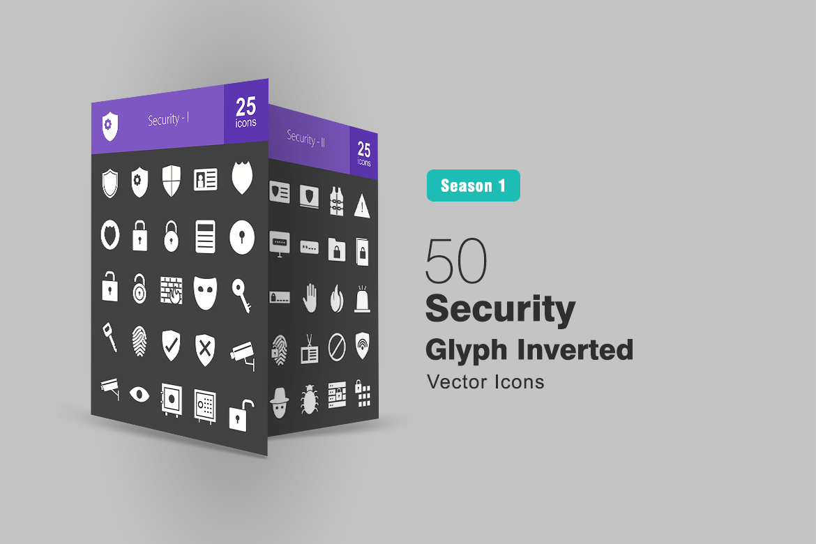 Download Набор иконок "50 Security Glyph Inverted Icon Set" / 50 Security Glyph Inverted Icon Set - Набор иконок на тему графика security icon shield identity card police badge lock key firewall mask fingerprint camera eye vault unlock protection system vest warning