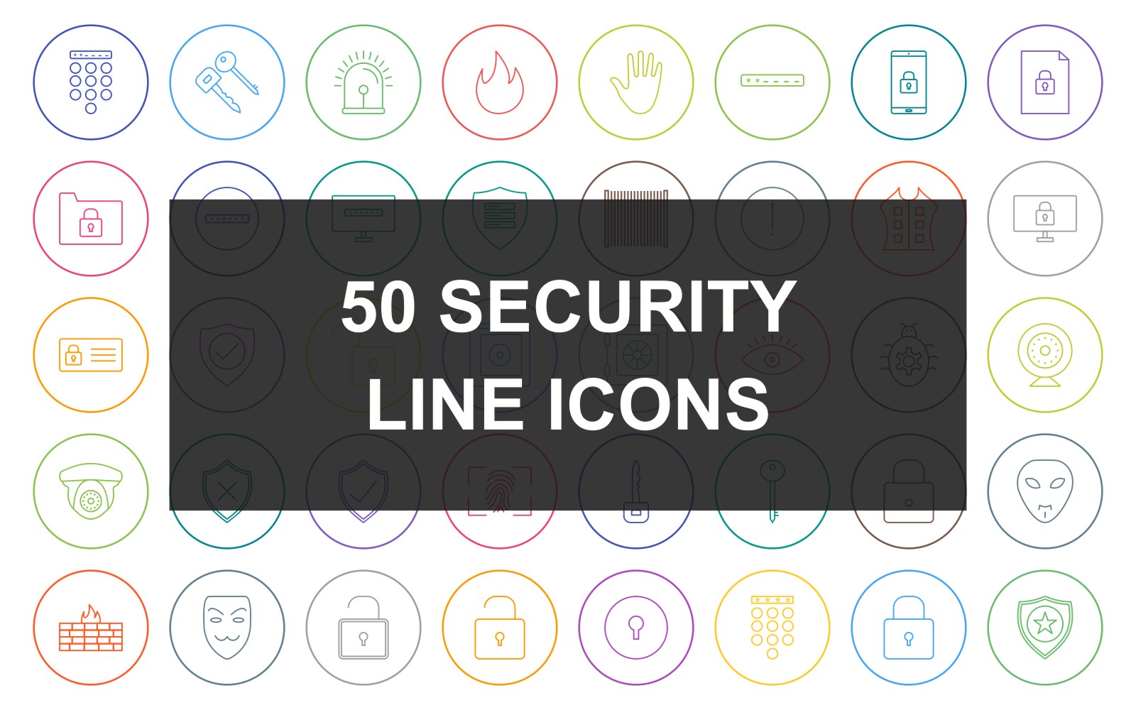Download Набор иконок "50 Security Line Round Circle Icon Set" / 50 Security Line Round Circle Icon Set - Набор иконок на тему security passcode lock,secure server,bug fixing,hacker mask,umbrella,no entry sign,identity card,fingerprint lock,keys,siren,fire,hand,enter passcode,secure device,secure document,secure folder,passwo