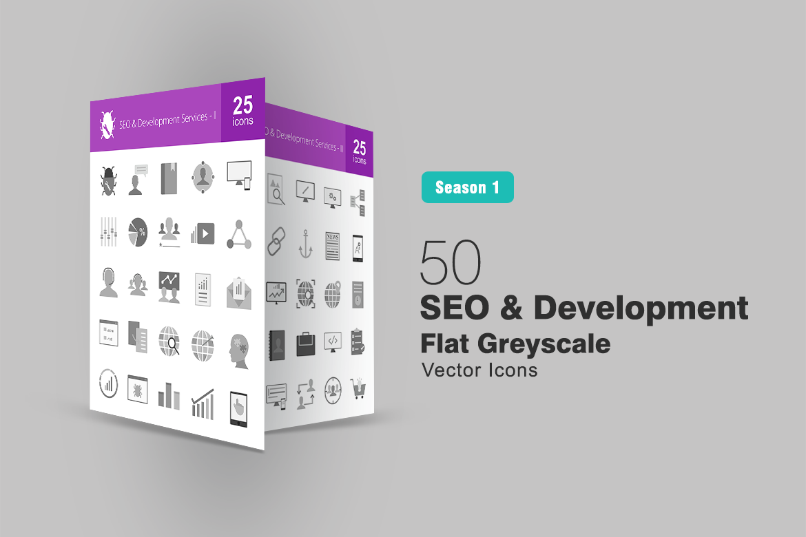 Download Набор иконок "50 SEO & Development Flat Greyscale Icon Set" / 50 SEO & Development Flat Greyscale Icon Set - Набор иконок на тему графика seo icon development services blog responsive design competitor analysis related content email marketing customer support mobile application game developing monitoring