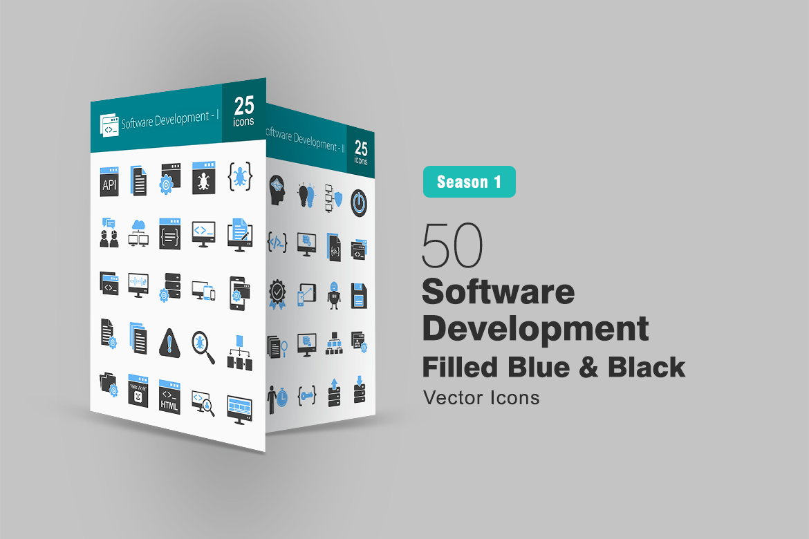 Download Набор иконок "50 Software Development Filled Blue & Black Icon Set" / 50 Software Development Filled Blue & Black Icon Set - Набор иконок на тему графика development,icon,software,developer,coding,programming,client,consultant,bug,code,console,content,dashboard,database,device,html,logic,network,puzzle,quality