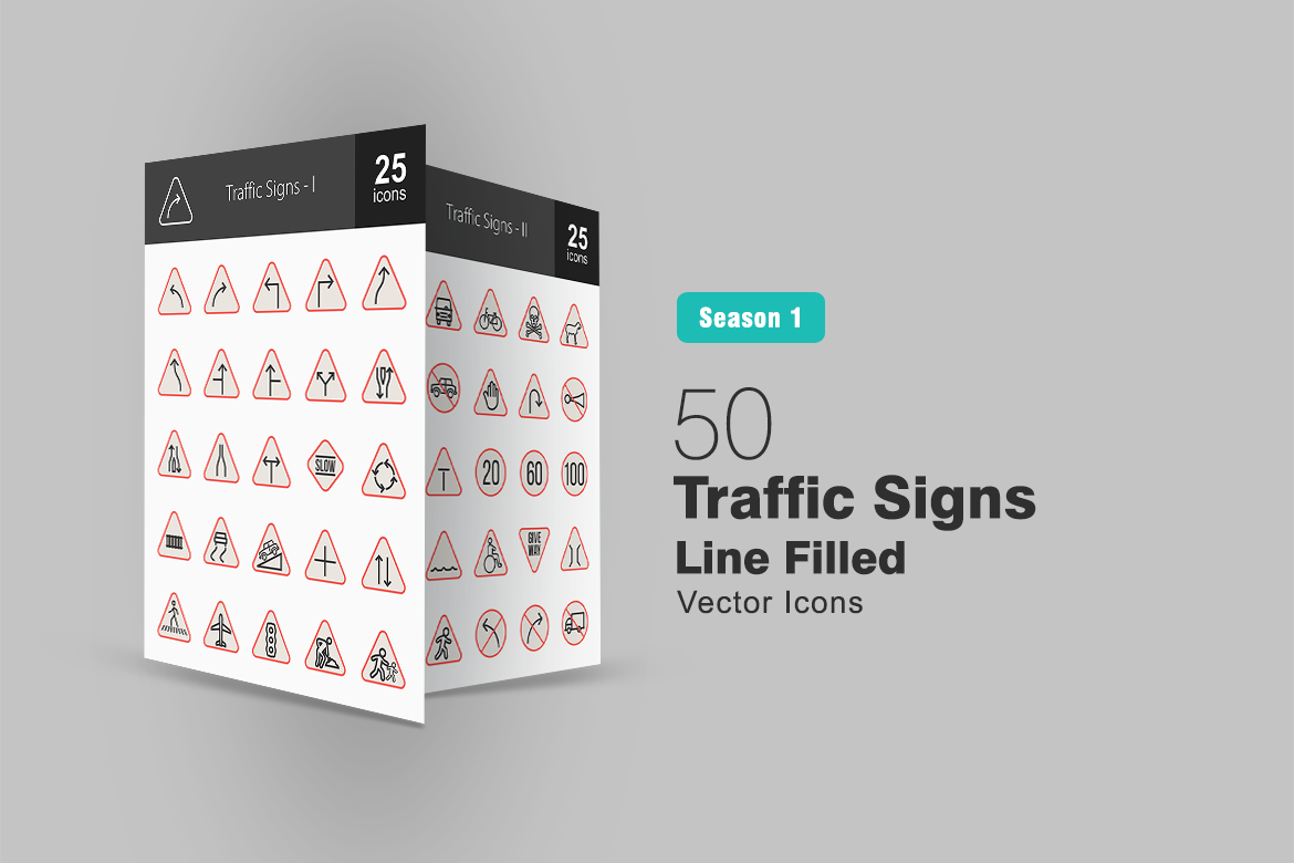 Download Набор иконок "50 Traffic Signs Filled Line Icon Set" / 50 Traffic Signs Filled Line Icon Set - Набор иконок на тему графика traffic icon signs curve turn signal bend lane horn danger sign give way stop railway dead end bridge speed limit
