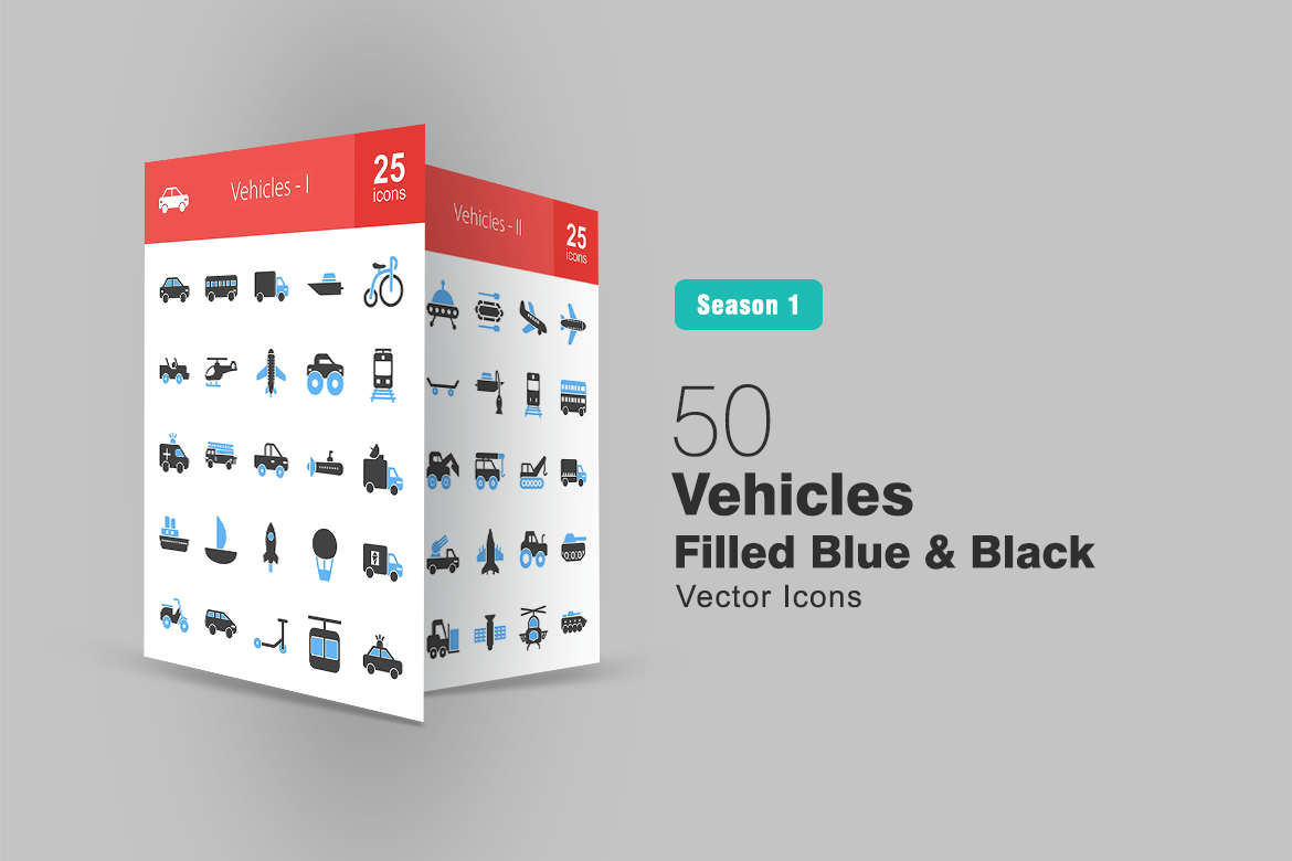Download Набор иконок "50 Vehicles Filled Blue & Black Icon Set" / 50 Vehicles Filled Blue & Black Icon Set - Набор иконок на тему графика vehicles icon transport car bus truck boat bicycle jeep helicopter plane ambulance submarine pickup yacht rocket balloon scooter shuttle ski