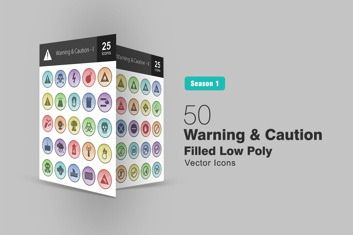 Download Набор иконок "50 Warning & Caution Filled Low Poly Icon Set" / 50 Warning & Caution Filled Low Poly Icon Set - Набор иконок на тему графика warning icon caution danger death sign explosion flammable construction garbage acid alarm rain radiation poisonous gas slipping flash crush zone