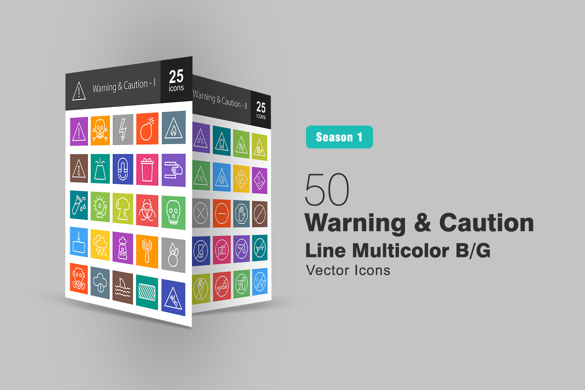 Download Набор иконок "50 Warning & Caution Line Multicolor B/G Icon Set" / 50 Warning & Caution Line Multicolor B/G Icon Set - Набор иконок на тему графика warning icon caution danger death sign explosion flammable construction garbage acid alarm rain radiation poisonous gas slipping flash crush zone