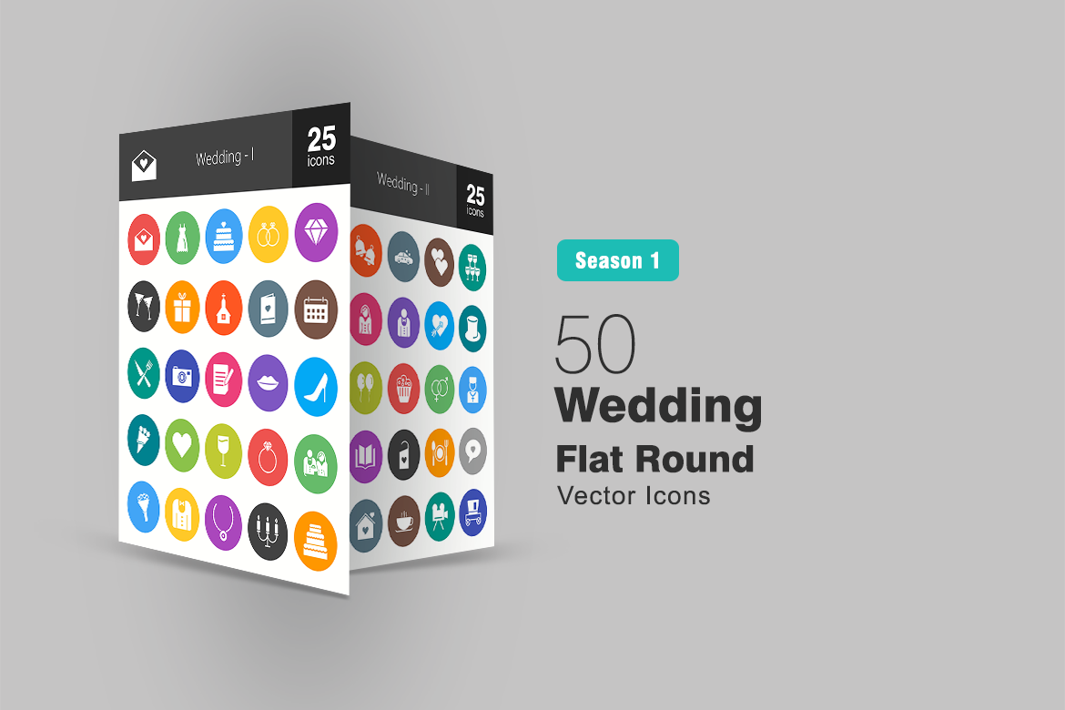 Download Набор иконок "50 Wedding Flat Round Icon Set" / 50 Wedding Flat Round Icon Set - Набор иконок на тему графика wedding icon bride groom cake rings invitation calendar date flowers drinks necklace music coffee dinner heels heart bells iconbunny flat