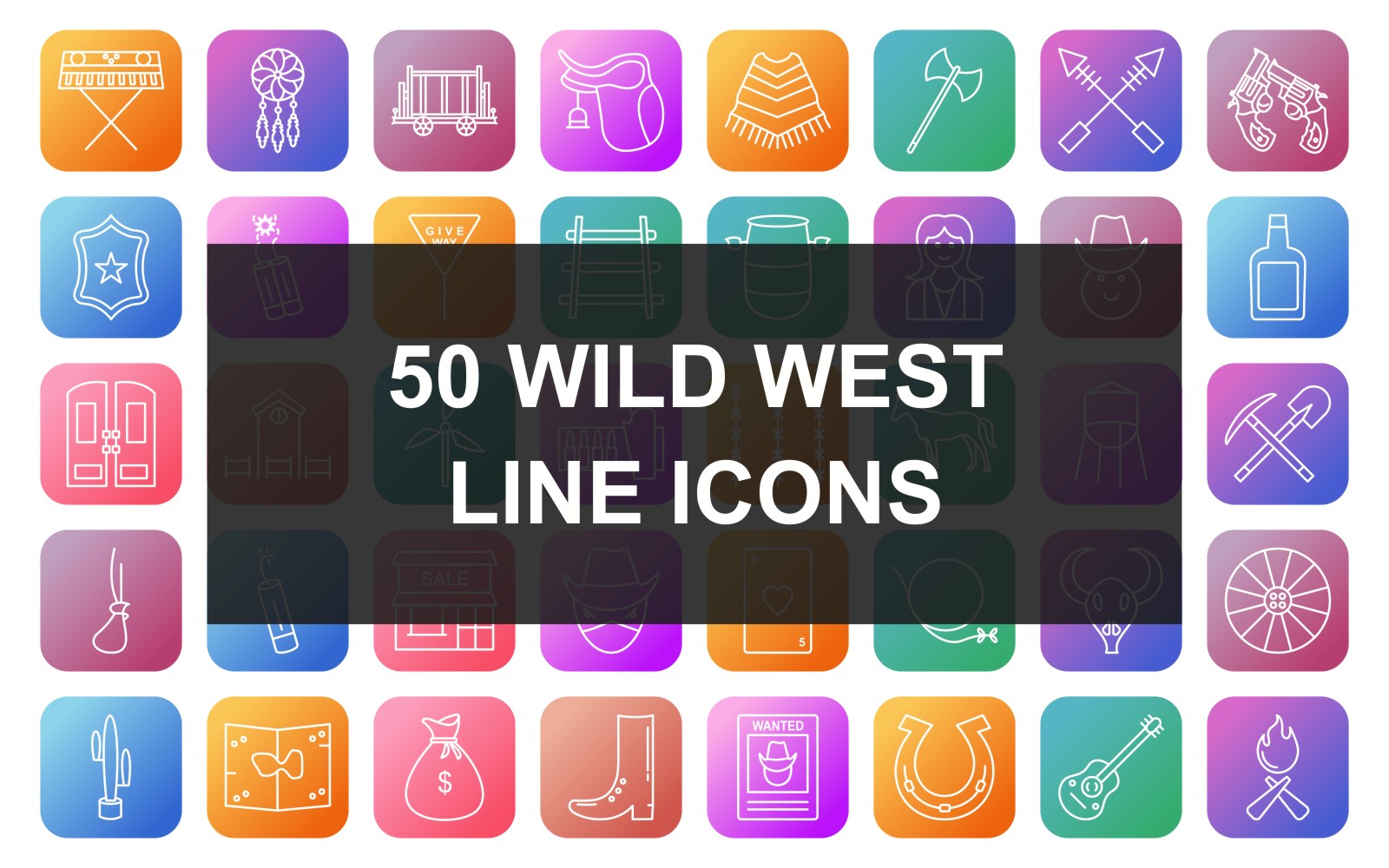 Download Набор иконок "50 Wild West Line Square Round Gradient Icon Set" / 50 Wild West Line Square Round Gradient Icon Set - Набор иконок на тему финансы piano,rails,water tower,map,oil lamp,gold,camp fire,coffin,desert,dream catcher,trolley,saddle,poncho,axe,arrows,two guns,badge,dynamite,sign,barrel